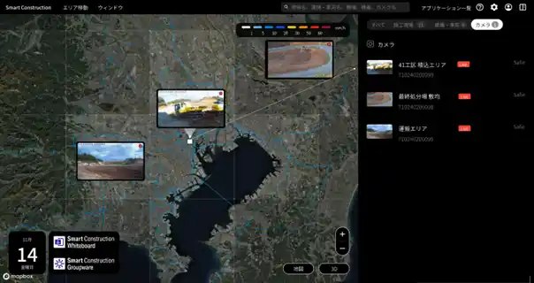 「Smart Construction(R)」のホーム画面に表示される地図情報上に、セーフィーの定点カメラ・ウェアラブルクラウドカメラの映像を統合。複数箇所のライブ映像を一つの画面で同時に確認でき、遠隔地からでも作業状況や安全面を俯瞰的に把握できます。 |