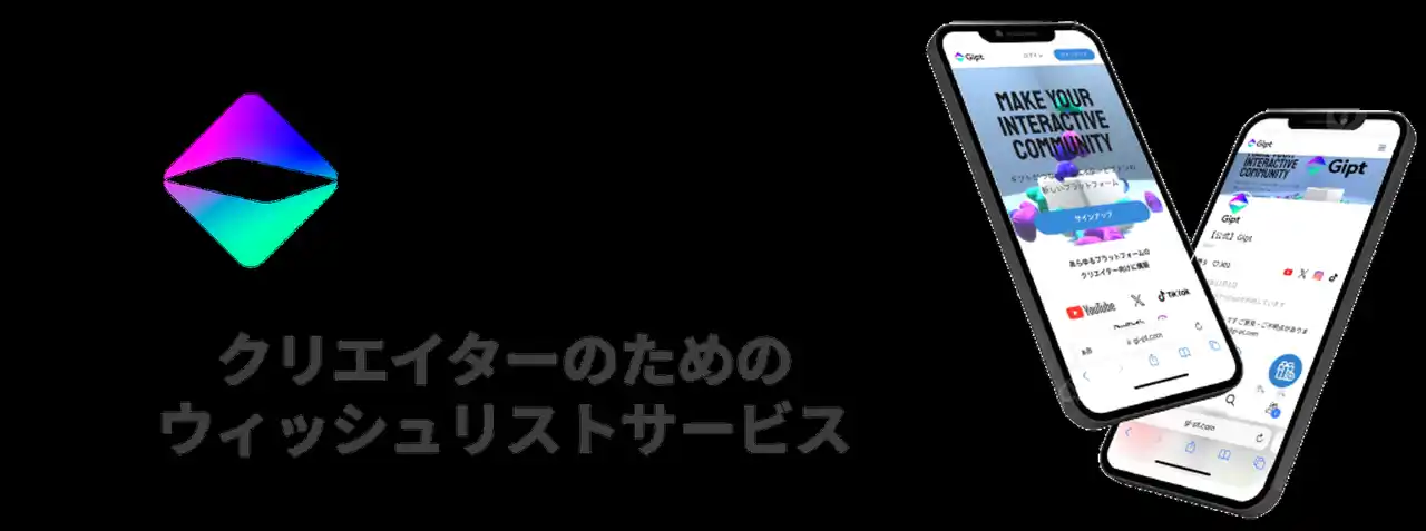 Giptは、クリエイター向けのギフトプラットフォームサービスです。Giptを使うことによって、クリエイターの方はファンの方から安全かつ便利にプレゼントを受け取ることが可能になり、プレゼントを媒介としたクリエイターとファンの相互的なコミュニケーションの活性化を図ることができます。 |