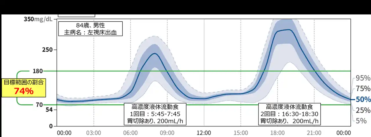 | 2回投与変更後14日間の24時間持続血糖変動の推移(600kcal/バッグ×2回の4症例) | ||||||||||||