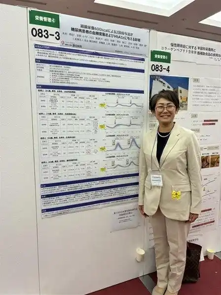 | 園田病院 栄養課からは、経腸栄養600kcal/バッグを用いた2回投与法が糖尿病患者の血糖変動およびHbA1cに与える影響について、症例報告を行いました。なお、本演題は第33回日本慢性期医療学会「優秀演題賞」を受賞しました。 | ||||||||||||