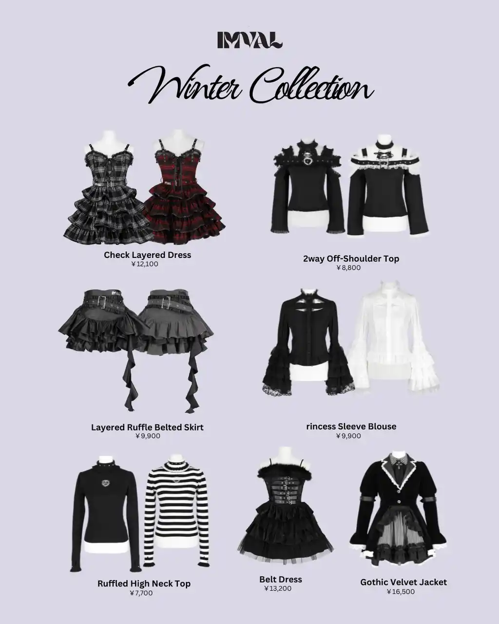 今季のテーマは、冷たく研ぎ澄まされた可憐。 レイヤードを重ねたドレスや、退廃を纏うベルテッドスカート、 聖と邪が同居するプリンセススリーブブラウスなど、 冬の闇に映えるブラックと深い赤が、少女性と毒気を共存させます。 |