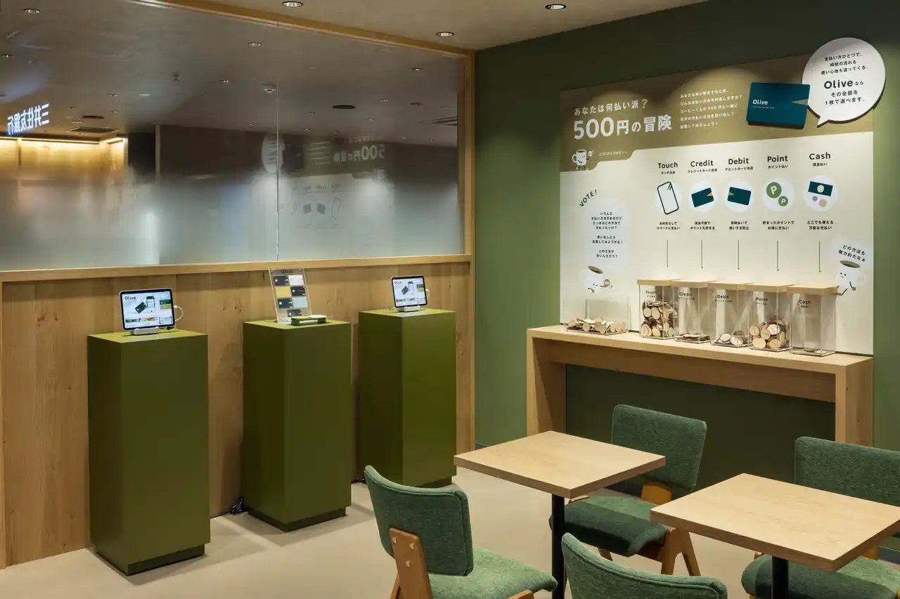 当店舗の1階と地下1階にスターバックスが出店し、地下1階には銀行の窓口やATMが併設されているため、仕事や買い物の合間に銀行へ行くことも、ひと休みをすることも可能な空間となっております。地下1階ではお金に関するセミナー等を開催する他、銀行窓口では口座開設等の各種お手続きや資産運用等のご相談を承ります。Olive LOUNGE初となる暮らしをモチーフに彩りと楽しさ、学びを提供する空間をご用意し、ご自身に相応しい決済方法などを楽しく学べる場を提供いたします。 |