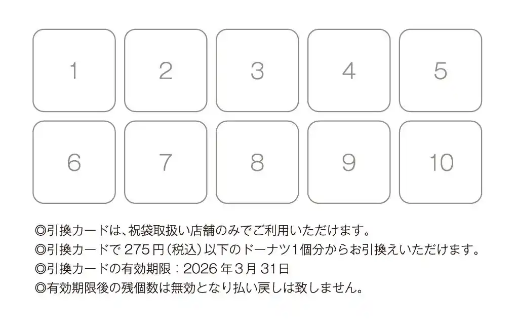 ドーナツ10個引換券(表) ご購入いただいた日から引換期限の2026年3月31日まで、店舗で引き換えいただけます。 |