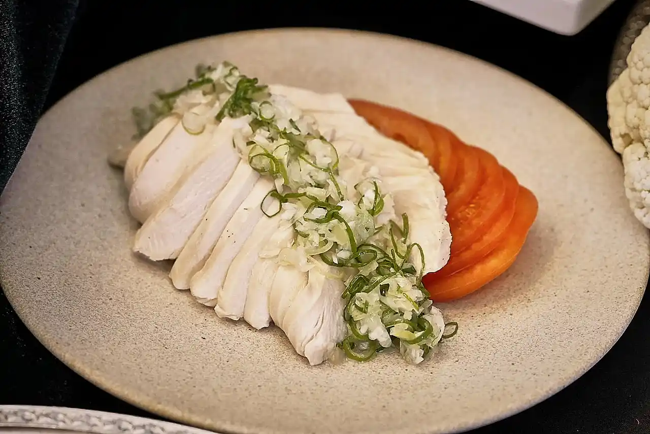 ・蒸し鶏 葱ソース(白鶏)(2月):「柔らかさ」よりも「噛んで美味しい」食感にこだわり。 |