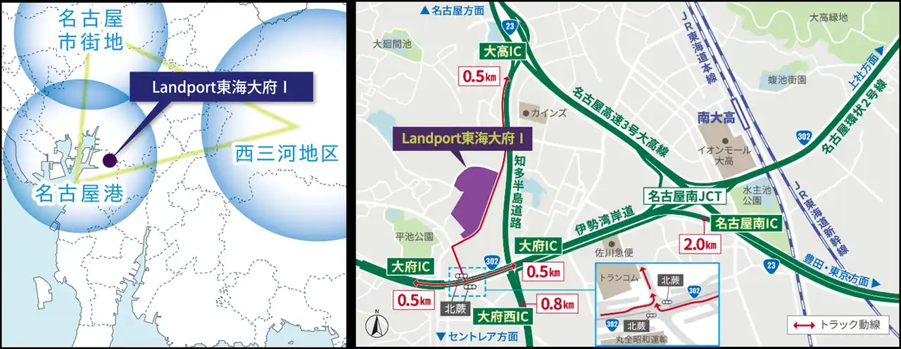 | また、本施設は伊勢湾岸自動車道「大府IC」へわずか約0.5km、名古屋市街地をはじめ、小牧や半島部へのアクセスに便利な「大高IC」へも約0.5km、加えて名古屋港へは車で約10分。名古屋市街地・名古屋港・西三河地区という中京エリアを形成する3つの拠点に対してもアクセスが良好であり、消費地配送・メーカー物流・輸出入貨物の取り扱いなど幅広いニーズに応えることができます。 | ||||