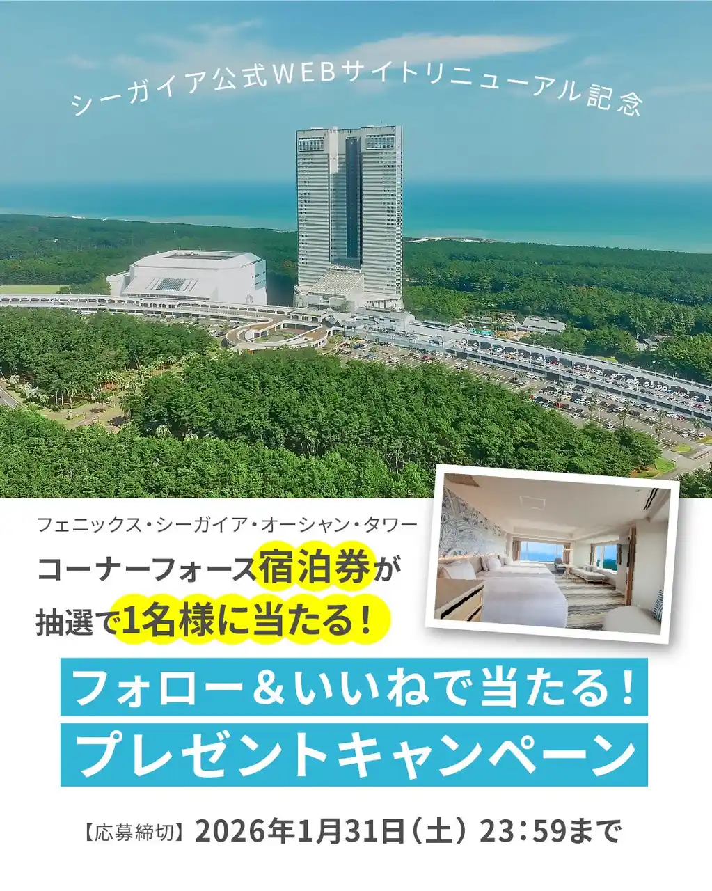 公式WEBサイトリニューアルを記念して、シーガイア公式Instagramにて「フェニックス・シーガイア・オーシャン・タワー」宿泊券が当たるキャンペーンを実施いたします。詳細は公式Instagramをご確認ください。 ■応募期間:2025年12月4日(木)13:00~2026年1月31日(金)23:59 |