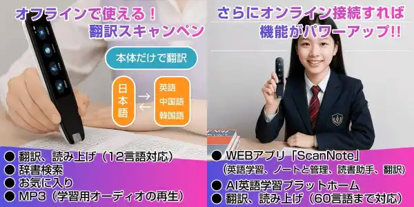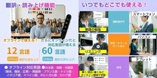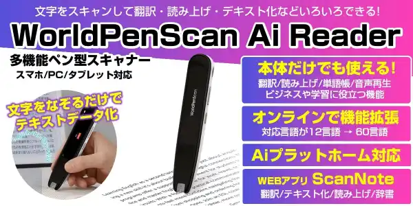 「WorldPenScan Ai Reader」は、紙の資料や本の文字をなぞってテキストデータ化できるOCR機能を搭載し、長文の日本語や英語などの文字入力を効率化できるほか、オフラインでも12言語の翻訳・読み上げが可能でオンライン接続時には60言語対応やAIプラットフォーム連携のWEBアプリ「ScanNoto」(翻訳/テキスト化/読み上げ/辞書)が利用でき、さらにmicroSDカードに保存された音源を繰り返し再生してリスニングや歌詞学習にも活用できる多機能ペン型スキャナーです。