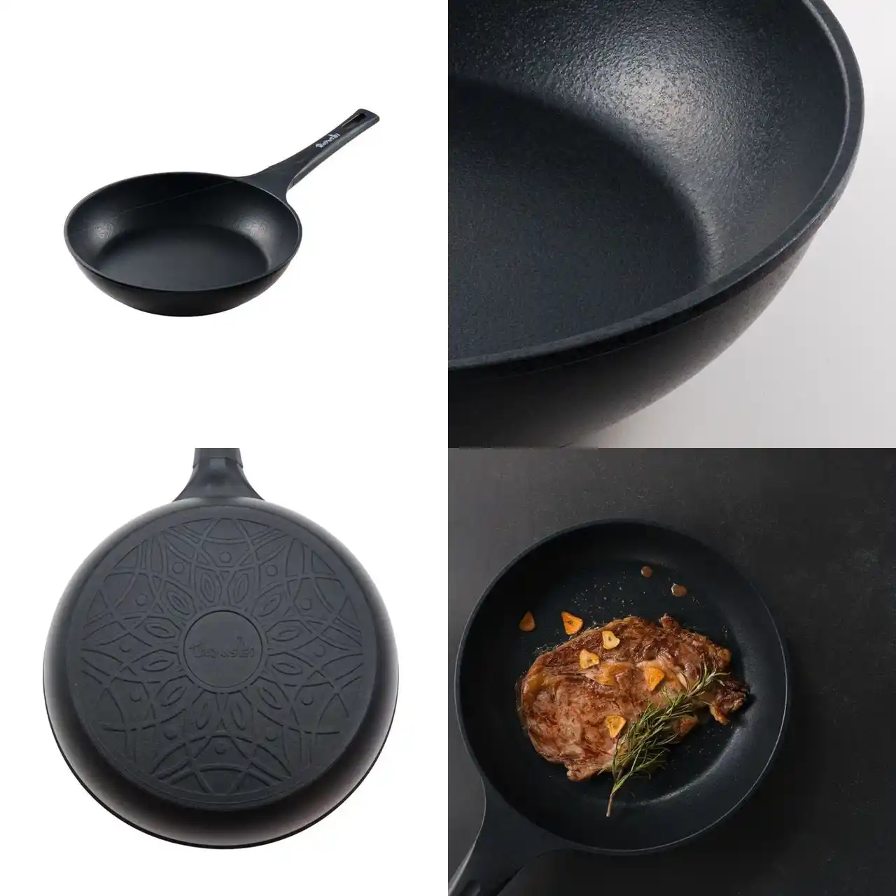 食材がこげつきにくい内側6層+外側4層、計10層ストーンコーティング。食材がスルッと進むから、焼く・炒める・煮詰めるがストレスなく決まります。洗うときもサッと落ちて、後片付けまで気持ちいい。 |