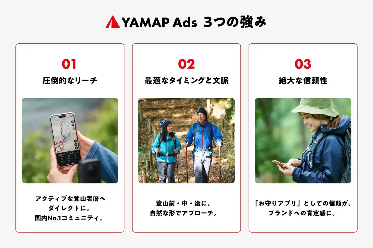 YAMAPは、国内シェアNo.1の登山アプリで、実際にフィールドへ足を運び、消費を行うアクティブなユーザーが集い、熱量の高いコミュニティが形成されています。実証期間を経て、多くの企業様から頂いた「信頼できる場で、熱心なファンと繋がりたい」という声に応え、ヤマップはユーザーの「熱量」と「信頼」を基盤としたマーケティングソリューション「YAMAP Ads」を本格展開いたします。 |