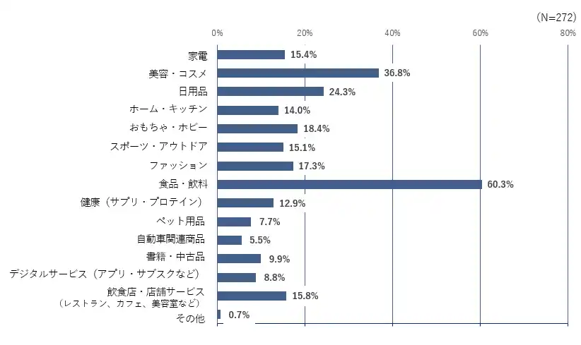 前述の質問で「購入したことがある」と回答した方に、何を買ったことがあるかを聞いたところ、「X」「Instagram」いずれも1位「食品・飲料」、2位「美容・コスメ」で、3位は「X」が「日用品」、「Instagram」は「ファッション」でした。日頃の生活での利用・消費機会が多い商品を訴求するSNSキャンペーンが、より商品購入に繋がっていることが伺えます。 |
