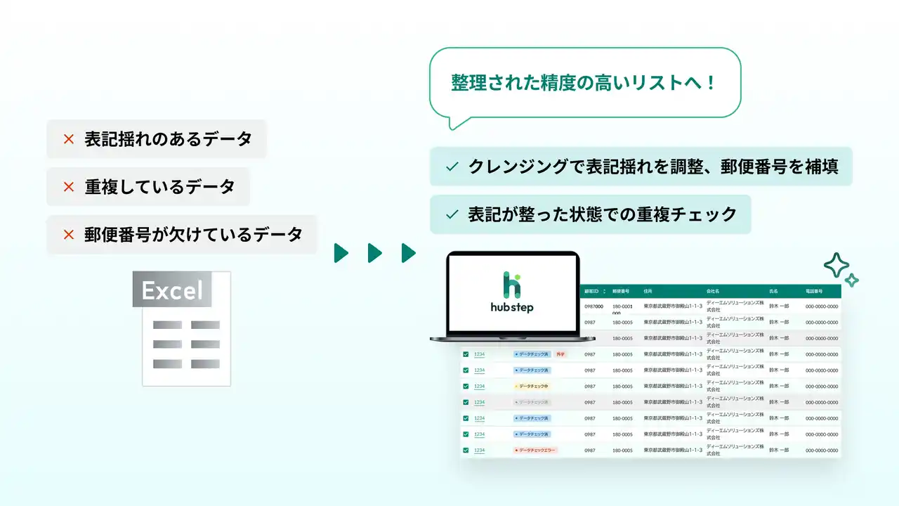 hubstepは、宛先データの整備から履歴登録までを自動化し、宛先管理業務を安全かつ効率的に運用できるクラウドサービスです。 |