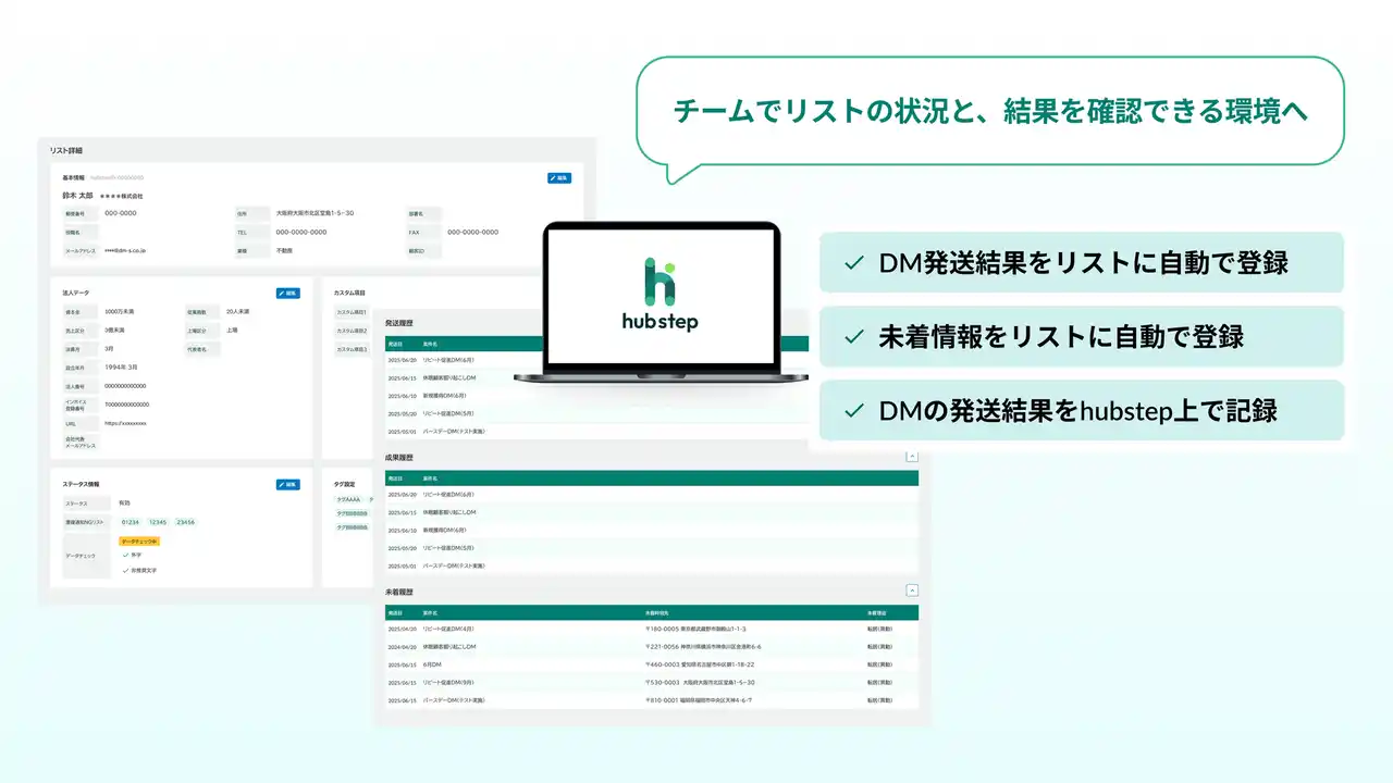 こうした環境を受け、当社はこれまで15,000社以上のDM運用支援で培った知見をもとに、“現場が安全に使える”宛先管理ツールとして「hubstep」を開発しました。 |