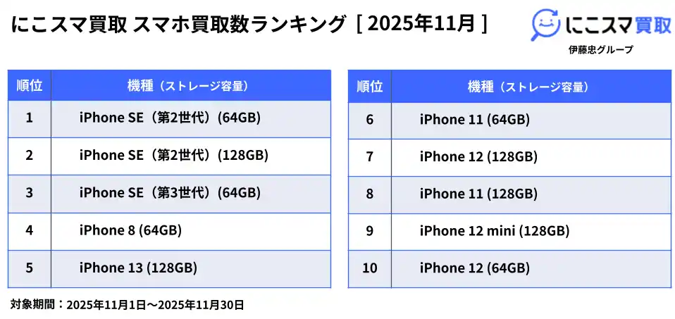 2025年11月の販売数ランキングでは、iPhone SE(第3世代)(64GB)が6か月連続で1位にランクインしました。 |