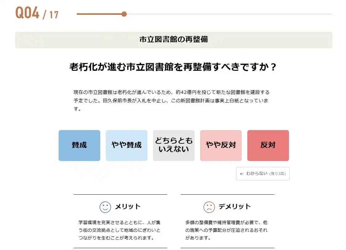 今回の市長選の「争点」として挙げられている市立図書館の再整備や物価高対策など幅広い分野の設問になりますが、全ての質問に概要を説明する「解説文」と「メリット」「デメリット」を記載することで、利用者の判断材料をご提供します。 |