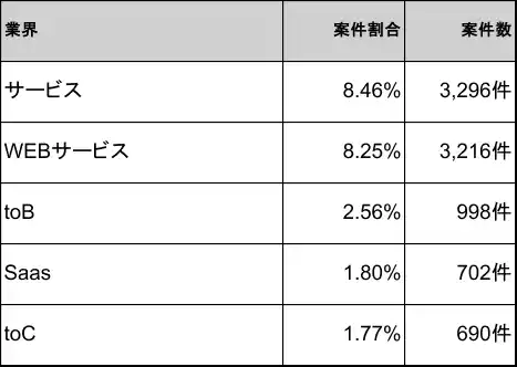 2025年12月時点のフロントエンドエンジニア向けフリーランス案件・求人は、サービスが8.46%(3,296件)で1位、WEBサービスが8.25%(3,216件)で2位、toBが2.56%(998件)で3位となっています。以下、SaaSが1.80%(702件)で4位、toCが1.77%(690件)で5位と続き、上位5業界で全体の約22.8%を占めています。 |
