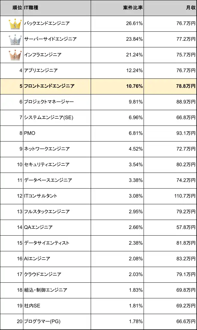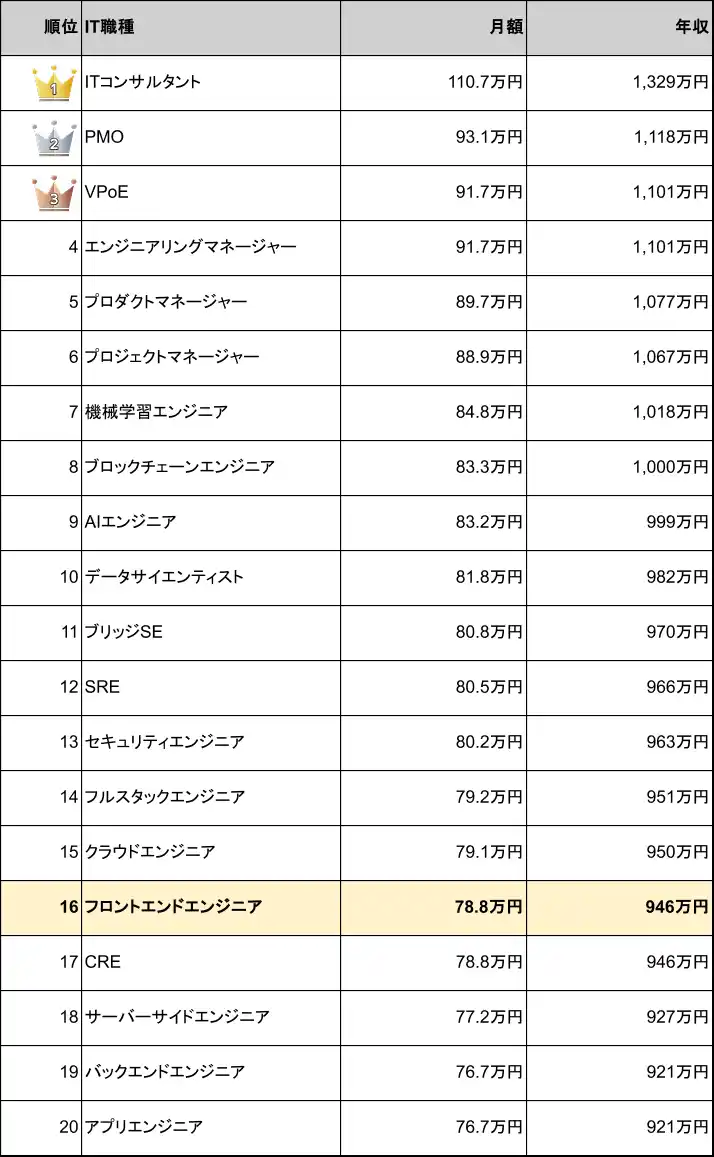 フロントエンドエンジニア案件の平均月額単価は78.8万円、平均年収は946万円で、IT職種別の年収ランキングでは16位に位置しています。 |