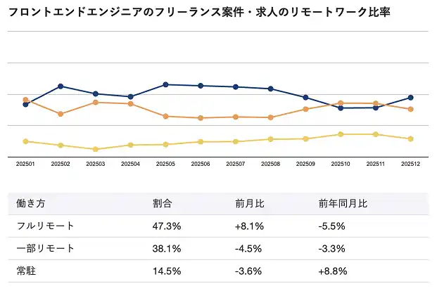 2025年12月時点のフロントエンドエンジニア向けフリーランス案件・求人におけるリモートワーク比率は、フルリモートが47.3%、一部リモートが38.1%、常駐が14.5%となっています。フルリモートと一部リモートを合わせると全体の8割以上を占めており、在宅を中心とした働き方が主流といえるでしょう。 |