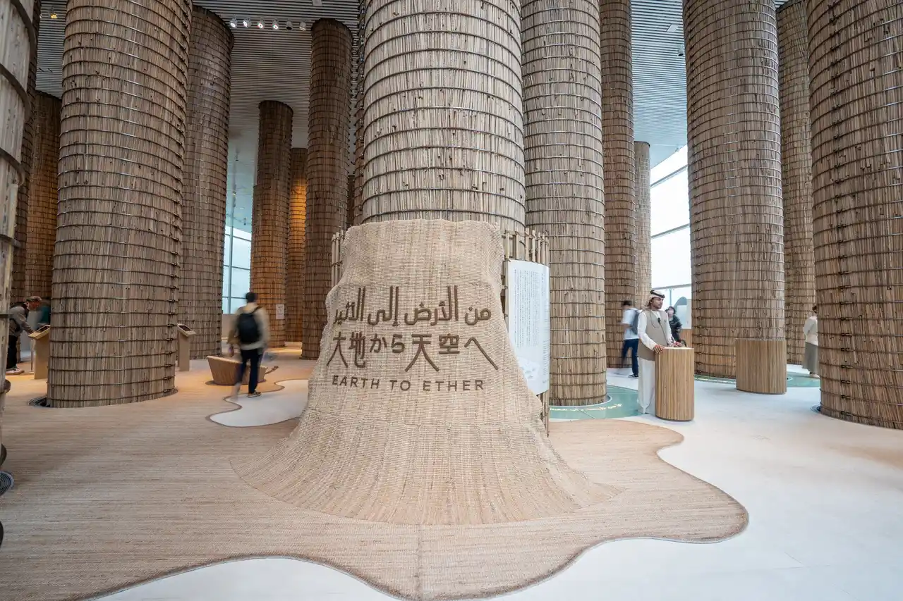 UAEパビリオンは Earth to Ether Design Collective によって設計され、会期を通して建築・クラフト・ストーリーテリングを有機的に結びつけました。デザインの着想源となったのはナツメヤシの木で、最大高さ16メートルに及ぶ「ナツメヤシの葉軸(ラキス)」を使用した90本の柱が、パビリオン内部に木陰を作り出し、オアシスにたたずむような静けさと温もりを来場者に提供しました。この空間デザインは、パビリオンのテーマである「大地から天空へ(Earth to Ether)」を象徴し、UAEが深い伝統に根ざしながら未来へ向けて歩みを進める姿を体現しています。 |