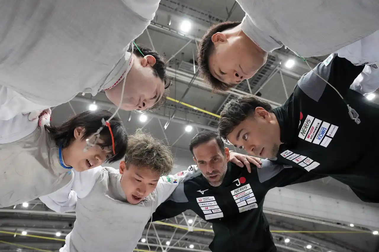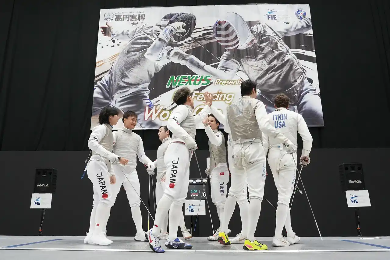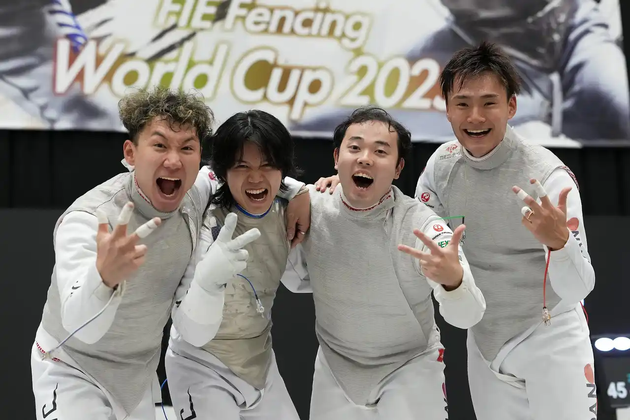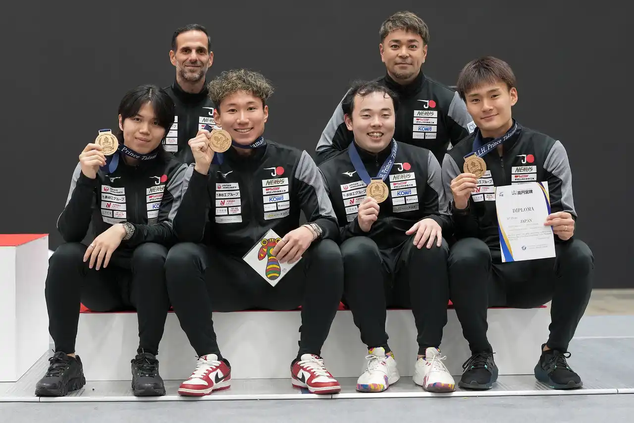 2025年12月7日(日)に日本/北九州市で開催された、フェンシングワールドカップにて、男子フルーレ日本代表チーム(松山 恭助/まつやま きょうすけ/株式会社JTB、飯村 一輝/いいむら かずき/慶應義塾大学、永野 雄大/ながの ゆうだい/NEXUS FENCING CLUB、西藤 俊哉/さいとう としや/株式会社セプテーニ・ホールディングス)が銅メダルを獲得しました。