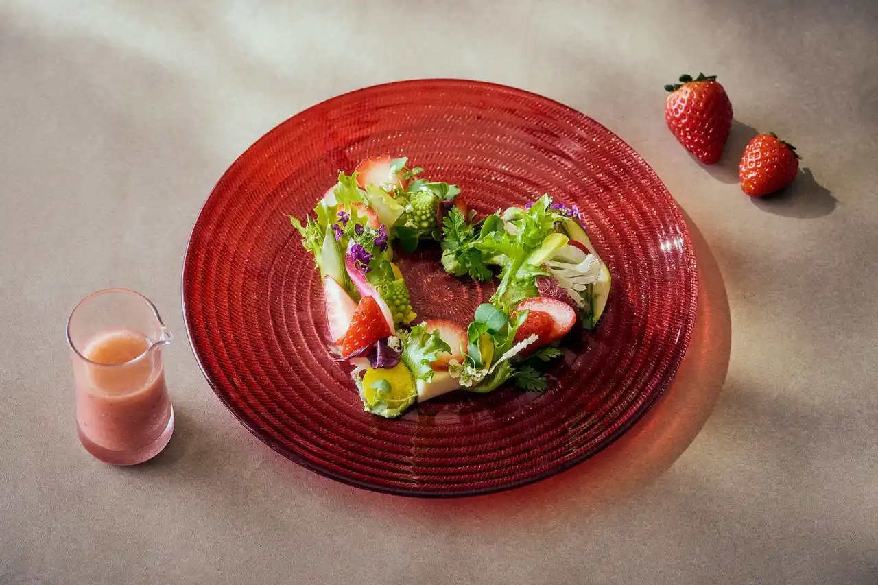 スイーツプレートは、ストロベリーとクレーム・ムースリーヌをピスタチオとアーモンドのスポンジで挟んだケーキを中心に、絵の具を混ぜたようなデザインのストロベリーレアチーズタルトや一晩紅茶に浸したドライフルーツを練りこんだイギリスの郷土菓子バラブリス、ストロベリーを挟んだミニエクレアやストロベリーマカロンを美しく並べ、アートのように描きます。ハーブクリームのサブレやビーツのタルト、パルメザン風味やストロベリー紅茶のスコーンを並べたプレートには、パプリカソースやパンプキンムースでパレットの絵の具を表現。ハートを描いたストロベリーのカプレーゼサラダと共に季節ならではの味わいをお楽しみいただけます。 |
