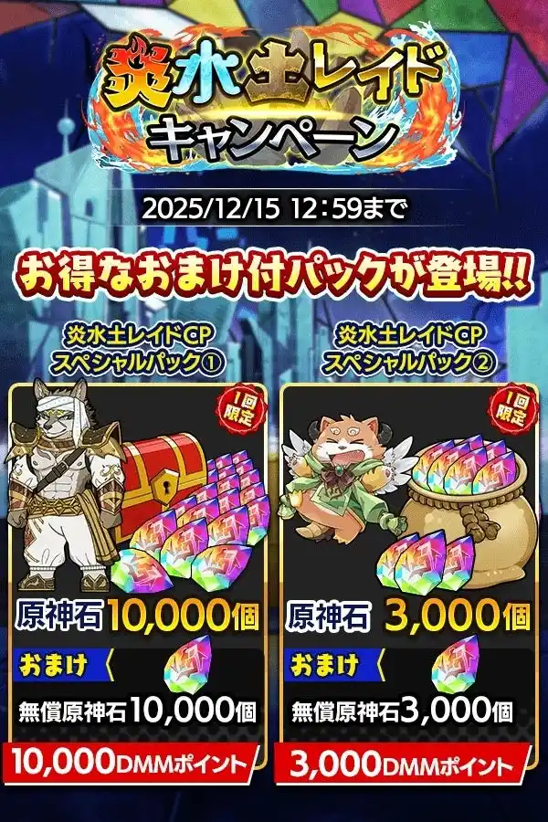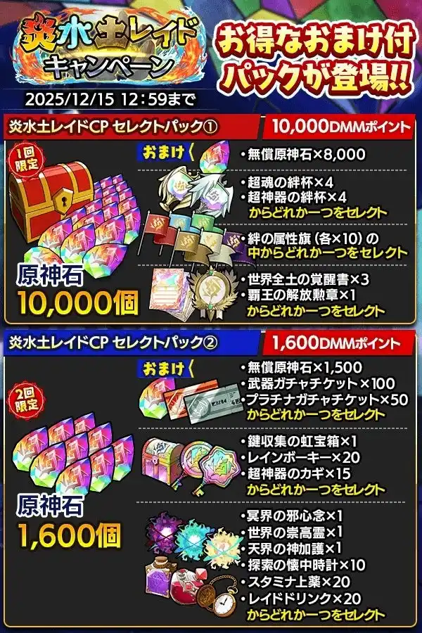 キャンペーン期間中、原神石がおトクに購入できる「炎水土レイドキャンペーンスペシャルパック」が2種登場!さらに原神石に加えて、ガチャチケットや限界突破アイテムなど、お好きなアイテムを選択できる「炎水土レイドキャンペーンセレクトパック」も2種登場! |