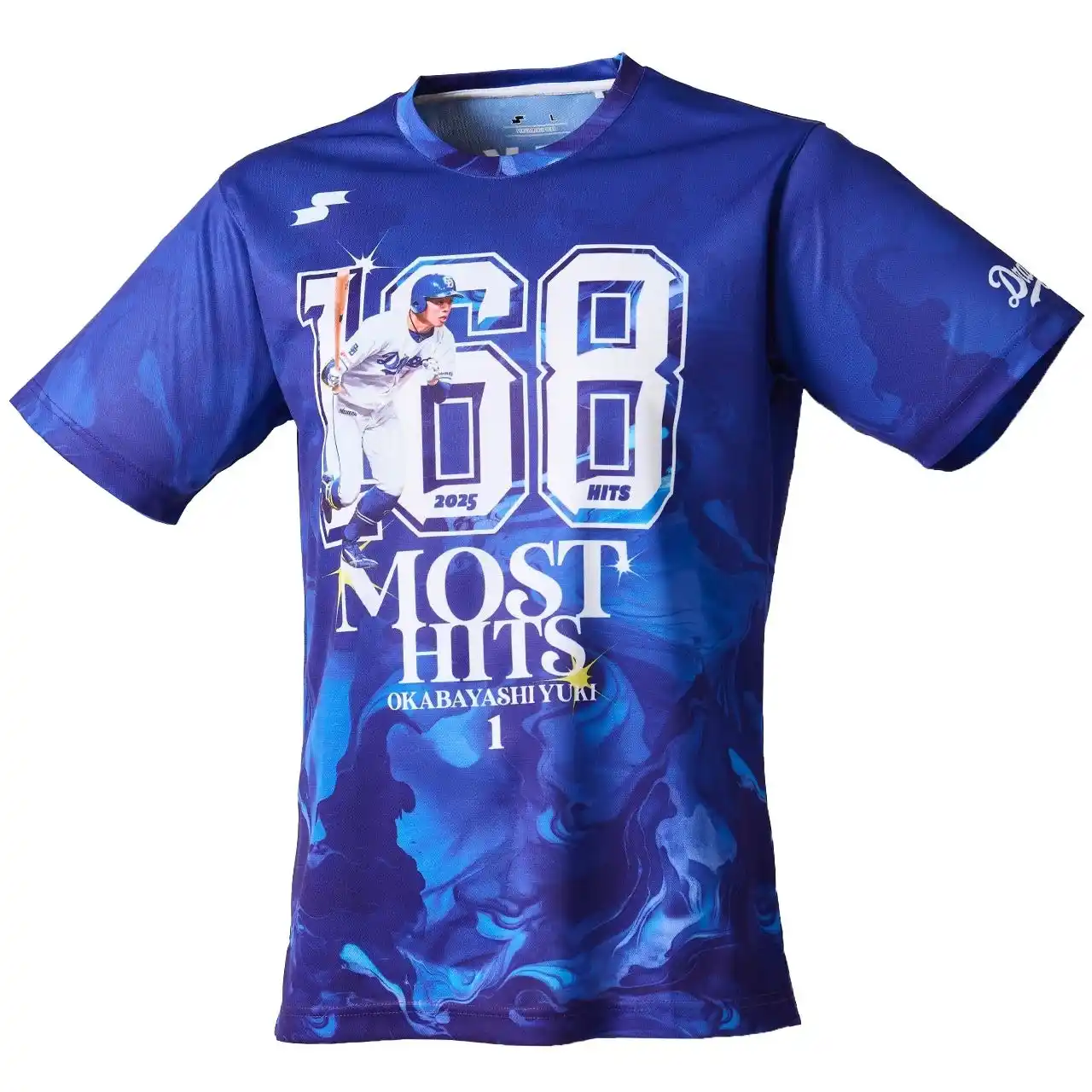 本記念Tシャツは、中日ドラゴンズをイメージした鮮やかなブルーのマーブル柄で、チームカラーの力強さとスピード感を表現しました。胸元には「168 HITS」と岡林選手の力強い打撃動作を配置。中央に“MOST HITS”、名前と背番号「1」をデザインし、左袖には球団ロゴをレイアウト。背面にも背番号とネームをプリント、シーズンの感動と選手たちの努力を、いつでも手元に感じられるSSKオリジナル記念Tシャツ。観戦にもコレクションにも最適な特別な1枚です。 |