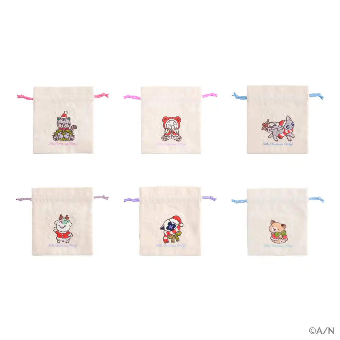 | グッズラインナップは刺繍入り缶バッジ、刺繍巾着、ぬいぐるみマスコット、オーナメント風マスコット、キーホルダーの5種類。 | |||||