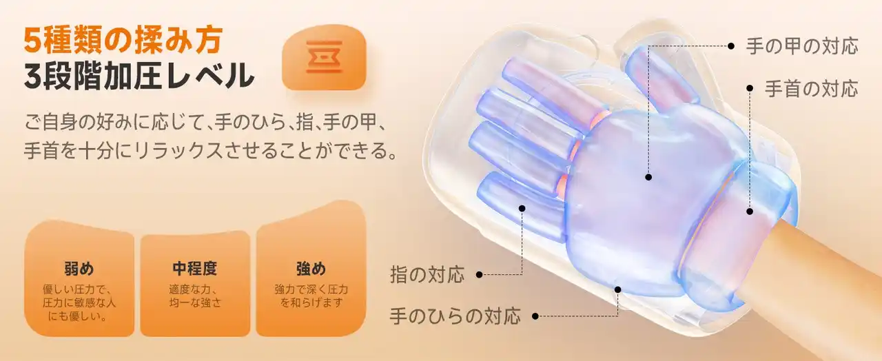 360度エアバッグが包み込む、的確なハンドケア 本製品は、手の曲線に沿ってエアバッグが密着するよう設計されており、手のひら・指先・手首までを包むようにケアします。 5種類のモード、3段階の強度調整により、多様なリラクゼーション動作(揉みほぐし・押圧・包み込み)を再現。エアバッグのグループ分け・加圧時間・圧力レベルがモードごとに最適化されており、内側から外側へじんわりと緊張を解放します。 左右どちらの手にも対応し、手の大きさを選ばずフィット。初回使用時は全機能が初期設定でスタートするため、初心者の方でも安心して使用できます。 |