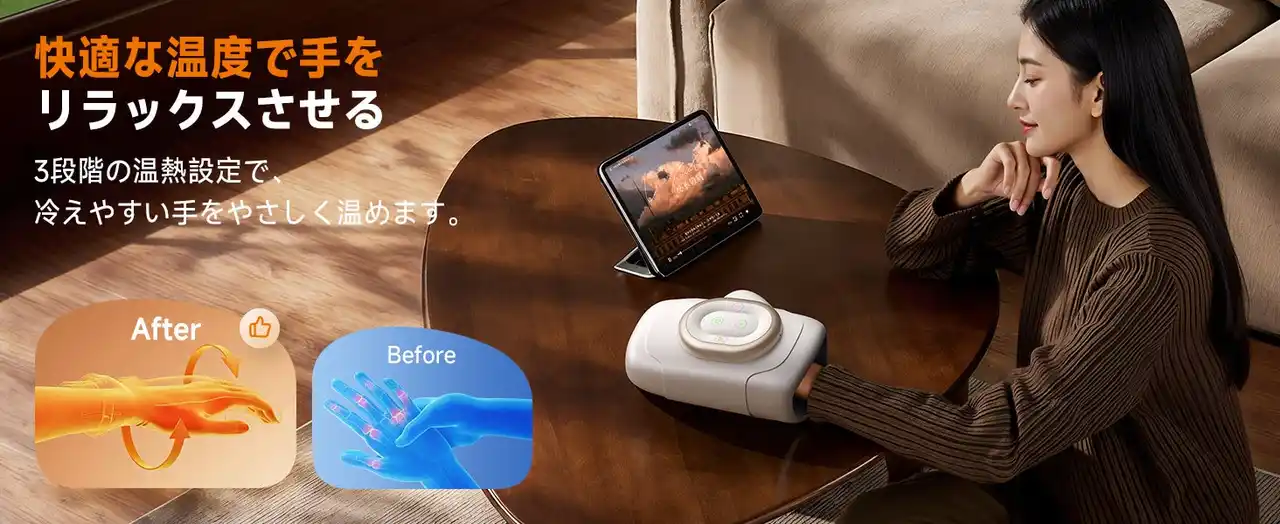 3段階の温熱機能で乾燥・冷え対策にも 39℃/42℃/46℃の3段階温熱機能を搭載し、季節や好みに応じて温度を調整可能。温熱OFFにも対応しており、年間を通して快適に使用できます。 お好みのハンドクリーム+付属手袋との併用で、乾燥が気になる手肌の集中ケアにも役立ちます。自宅はもちろん、オフィスでのリラックスタイムにも最適です。 |