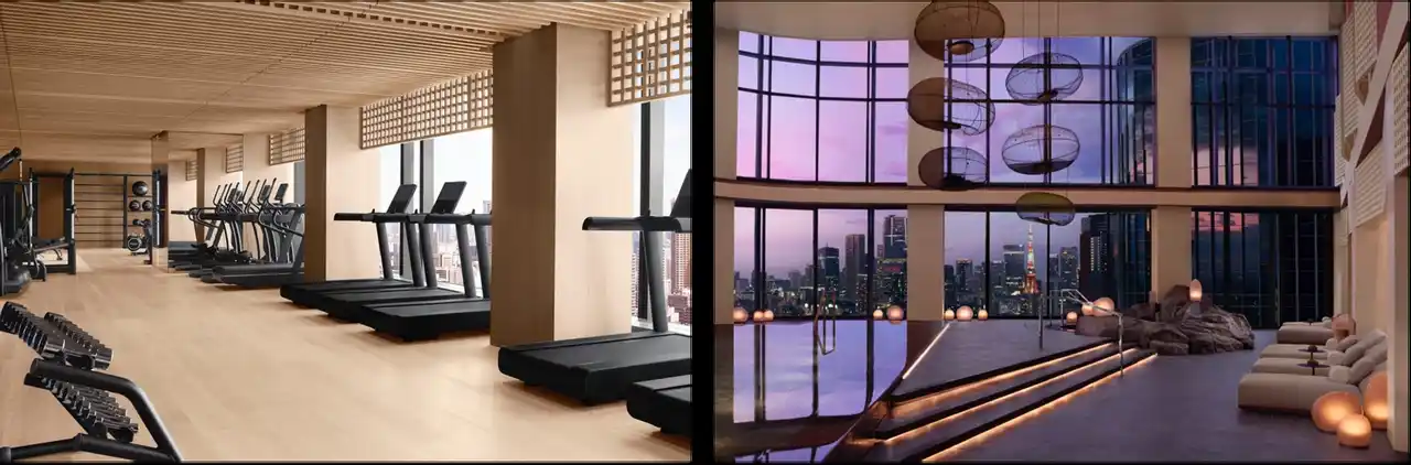 ウェルネス施設として、ホテル高層階(28階)に位置する屋内プールは、東京・高輪の街並を臨むパノラマビューが広がる静けさに包まれた癒やしの空間で、全長25mのプールとウィールプール(ジェットバス)を備え、トレーニング後にはドライサウナ、スチームサウナも完備。マインドフルアワーも設けています。24時間利用可能なフィットネスセンター(28階)には、最新の有酸素運動マシンやテクノジム製のストレングスマシン、フリーウェイトスペースが備えられています。トレーニングルームでは、モーニングヨガ(7:00~8:00、無料、要予約)や、パーソナルトレーニング(有料、要予約)も利用可能です。 |