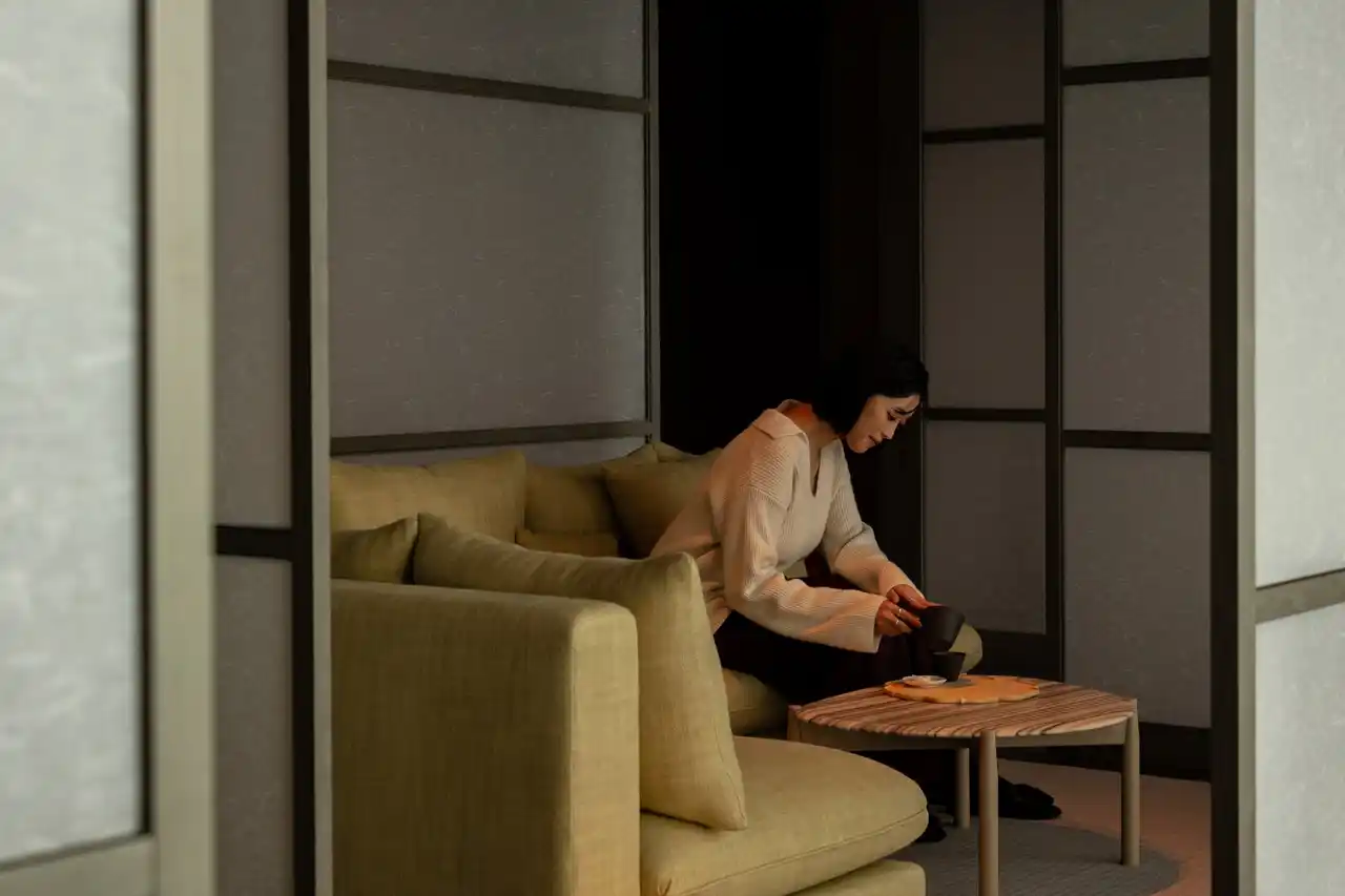 30階のロビーの一角には、JWマリオット・ホテル東京のマインドフルネスの哲学を体現する瞑想ルーム「セリーンスペース(Serene Space)」は、色、音楽、香りが織りなす心安らぐ空間として、慌ただしい日常から離れ、ゲストが心を静め、自分自身と向き合うための安息のひとときをお届けします。 |