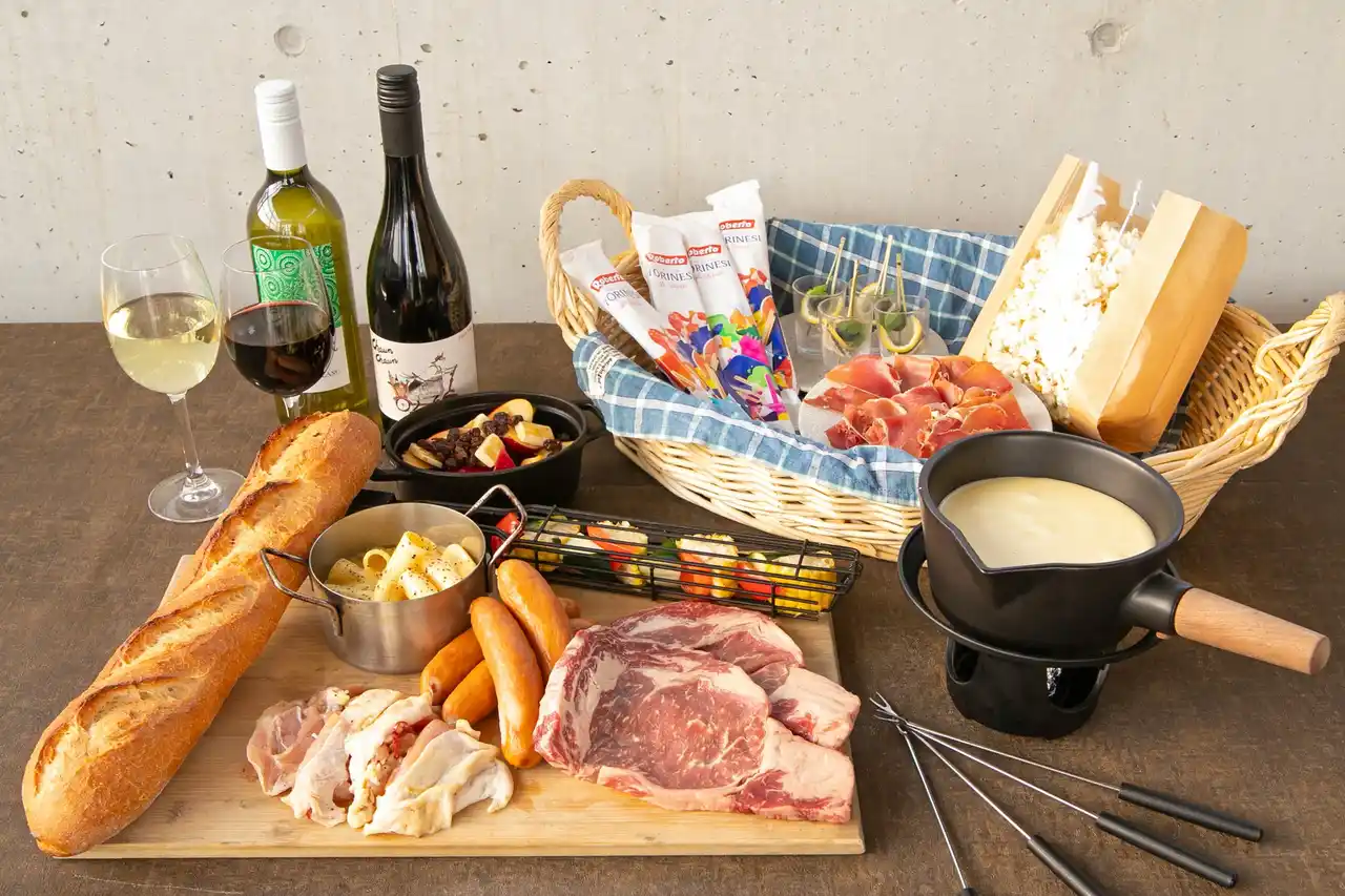 ・チーズフォンデュBBQ [バケット、じゃがいも、ブロッコリー、リブアイロール、ソーセージ、チキン] ・生ハム&グリッシーニ ・イワシとオリーブのレモンマリネ ・トリュフポップコーン ・チーズフォンデュで仕上げるカルボナーラ ・ラムレーズン焼きリンゴ |