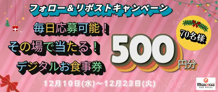 あわせて2025年12月10日(水)午前11時~2025年12月23日(火)の期間に「宮本むなし公式Xフォロー&リポストキャンペーン」を実施いたします。宮本むなしの公式Xアカウントをフォローし、キャンペーン投稿をリポストすることで期間中毎日応募でき、その場での抽選で定食屋宮本むなし店内でご利用いただける500円分のデジタルお食事券が当たるキャンペーンです。ぜひこの機会に宮本むなし公式Xのフォロー&リポストでのご参加をお待ちしております。 |
