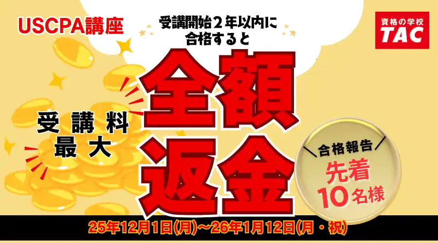 | 「USCPAって難しい?」「どうやって勉強を始めればいい?」そんな疑問を解消する無料セミナーを開催中!資格概要やTACの効果的な学習法を解説。参加者には受講料割引券をプレゼント! | |||||||||||