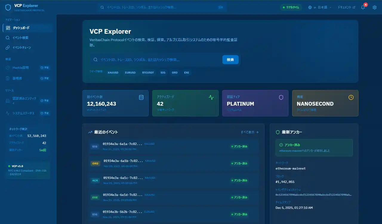 VCP V1.0は、世界初のAI金融における世界初の『証明レイヤー』 です。 |