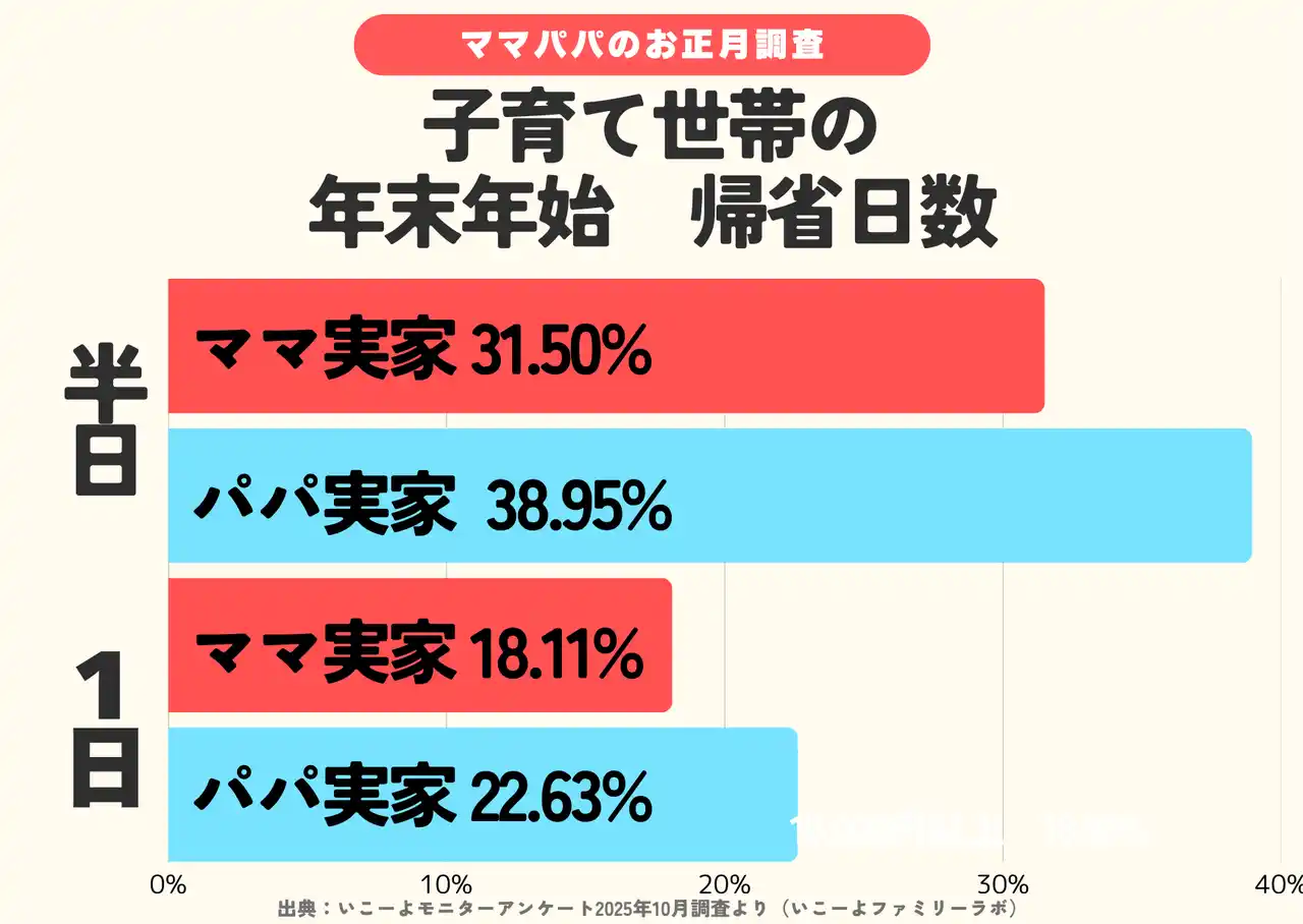 | パパ実家への帰省は半日から1日の日帰りが多く、ママ実家への帰省は「3泊4日」「4泊5日以上」でパパ実家への帰省を上回りました。 | |||||||||||||||||||||