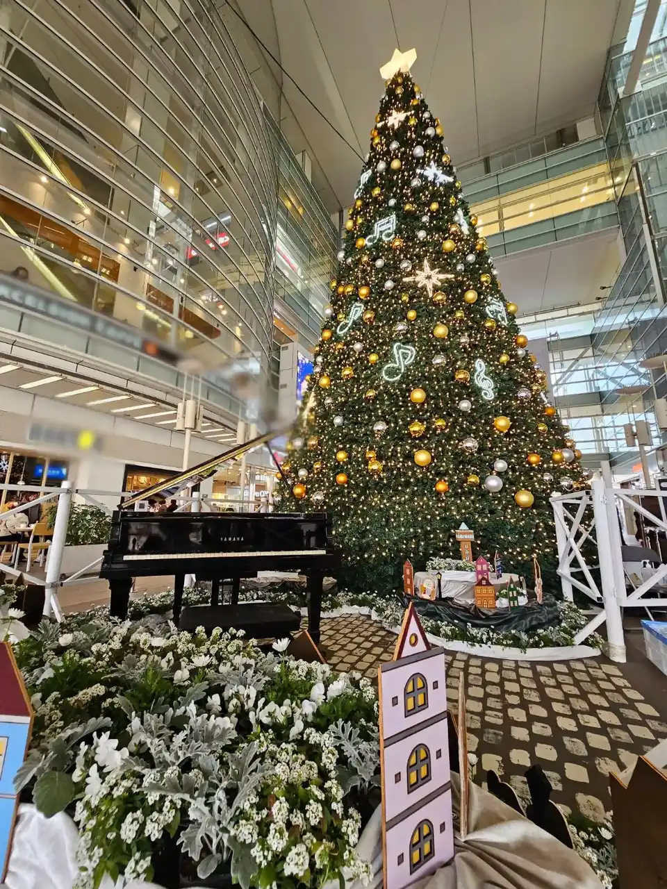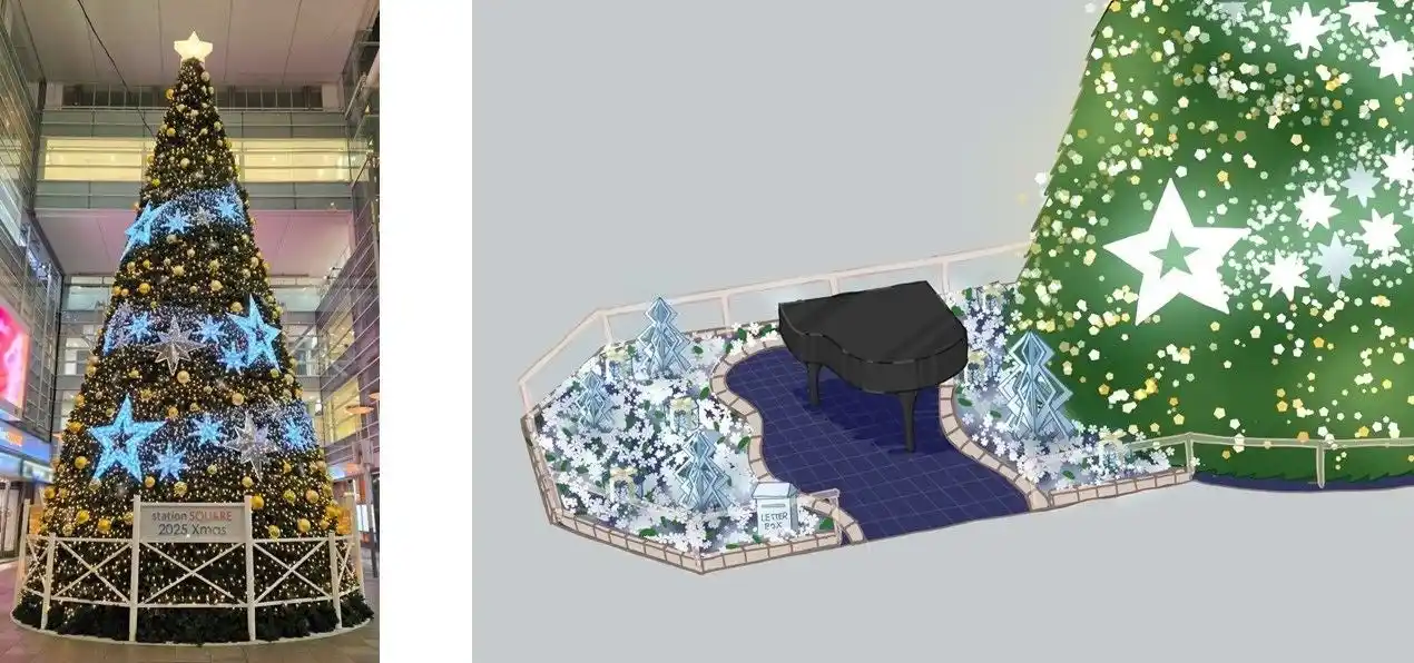 相模大野ステーションスクエアのクリスマスツリーと一体となるようピアノを設置します。 |