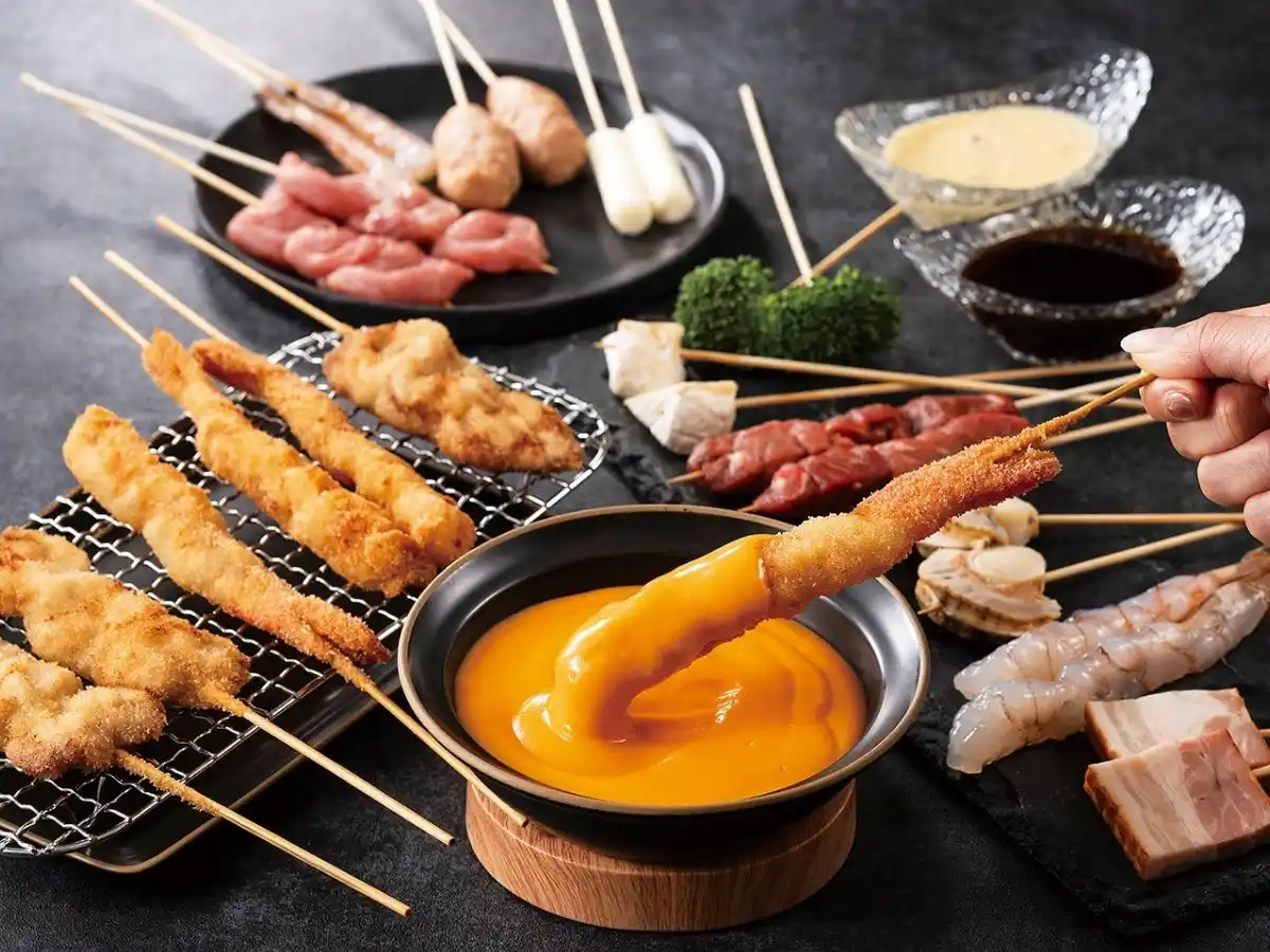 | 野菜・肉の定番串、タコ焼きやシューアイスなどの変わり串に加え、チーズ三昧コースでは『カマンベールチーズ』・『チーズINハンバーグ』などのチーズ串が登場! | ||||||||||||||