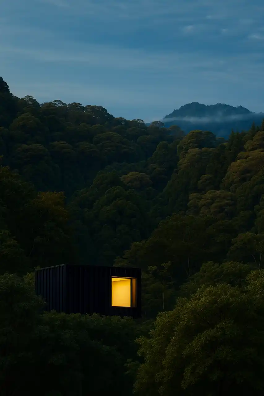 (イメージパース)森の最上段に静かに灯る、完全自立型キャビン |