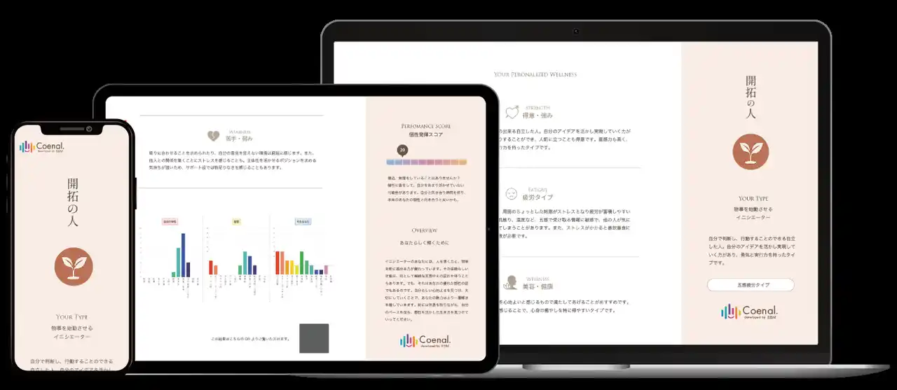 「Coenal.(コエナル)」は、そのような背景から「お客様を深く知る」ことを突き詰め、物理学者 柊木匠氏と共同で開発したパーソナライズウェルネス診断です。延べ450万人以上のお客様との対話から培ったノウハウと、2万人の臨床データから生まれた声紋分析技術を掛け合わせました。 |