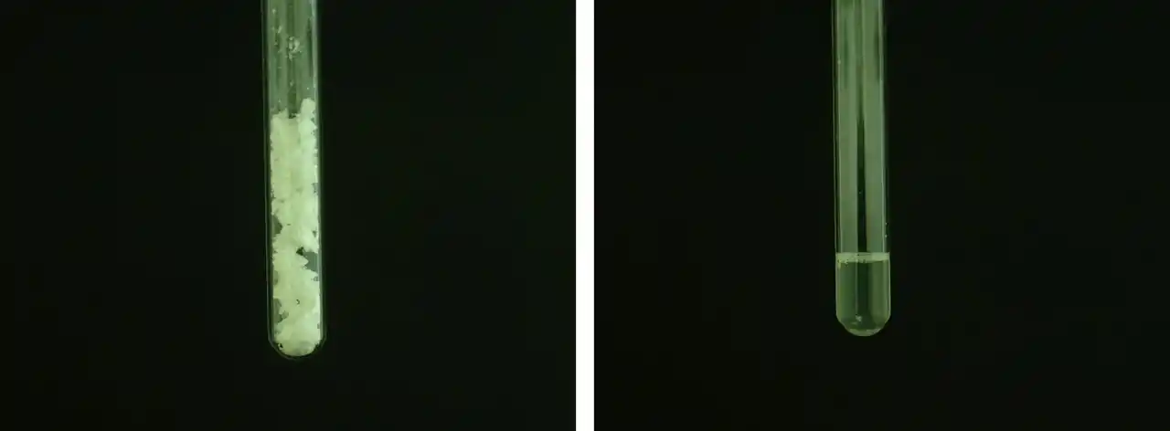 左:溶解前のシルクパウダー 右:水に溶けたシルクパウダー |