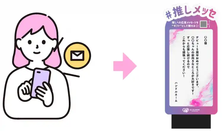本サービスでは、ファンにメッセージギフトをご購入いただくことで、応援の声をライブやイベントの現場で“推し”に届けられるという、新しい応援体験を提供しています。 |