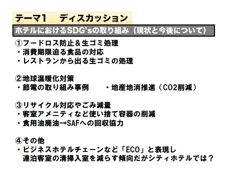 近年注目を集めている「SDGs」とホテル業界に関連付いている目標の解決のためにできることをディスカッションしました。レストランのフードロス問題や、アメニティなどホテルならではのSDGsの推進について学びました。 |