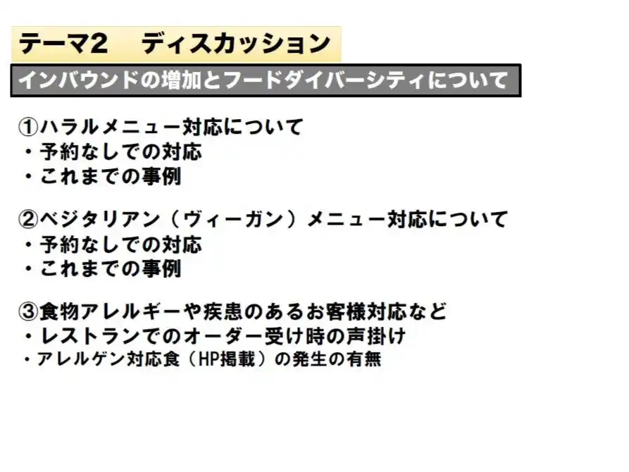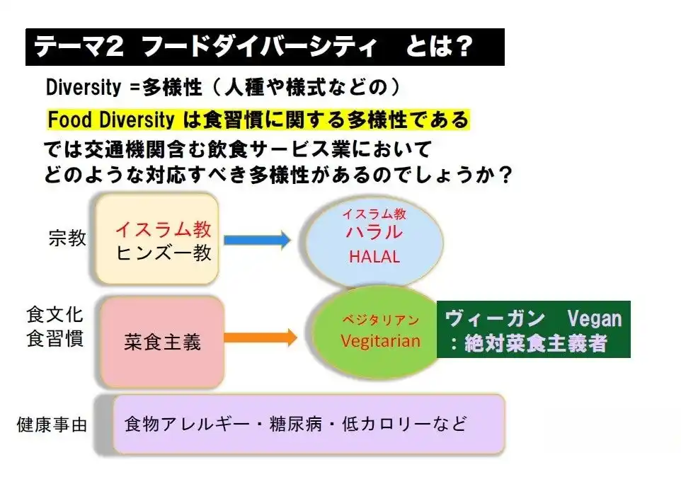 外国人観光客数の増加が続いている日本の観光業界では「フードダイバーシティ」への理解が一層求められます。形式的に食べられるもの・食べられないものを覚えるだけではなく、「なぜ食べられないのか」背景を理解することで、観光客に対する正しい対応を学びました。 |