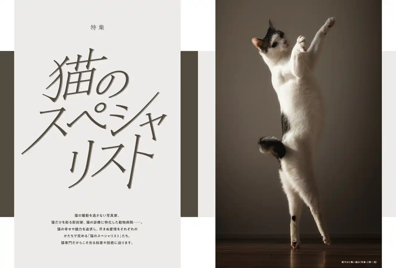 | 今号特集には、猫の幸せや魅力を追求し、尽きぬ愛情をそれぞれの形で究めた「猫のスペシャリスト」が集います。猫の一瞬の動きを捉える写真家、猫だけを彫る彫刻家、猫専門の動物病院など、猫に特化するからこそ光る知恵や技術についてお話を伺いました。 | |||