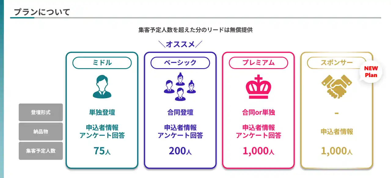 登壇せずに全セミナー申込者のリードを獲得できるプランが登場しました。 |