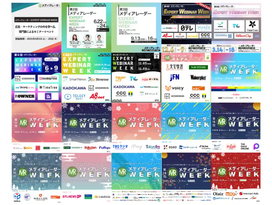 広告業界のプラットフォームであるメディアレーダーは、1週間でさまざまな広告・マーケティングジャンルのセミナーを行うオンラインセミナーイベント「メディアレーダーWEEK」を年4回(3月・6月・9月・12月)開催しています。 |