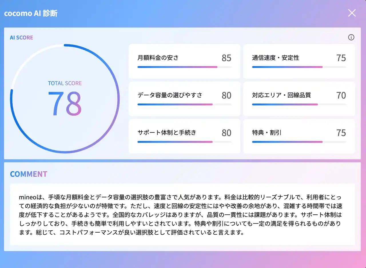 独自開発の「cocomo AI」が、各格安SIMを6つの観点で数値化。客観的な指標をもとに、ユーザーが直感的に比較できるようになりました。 |