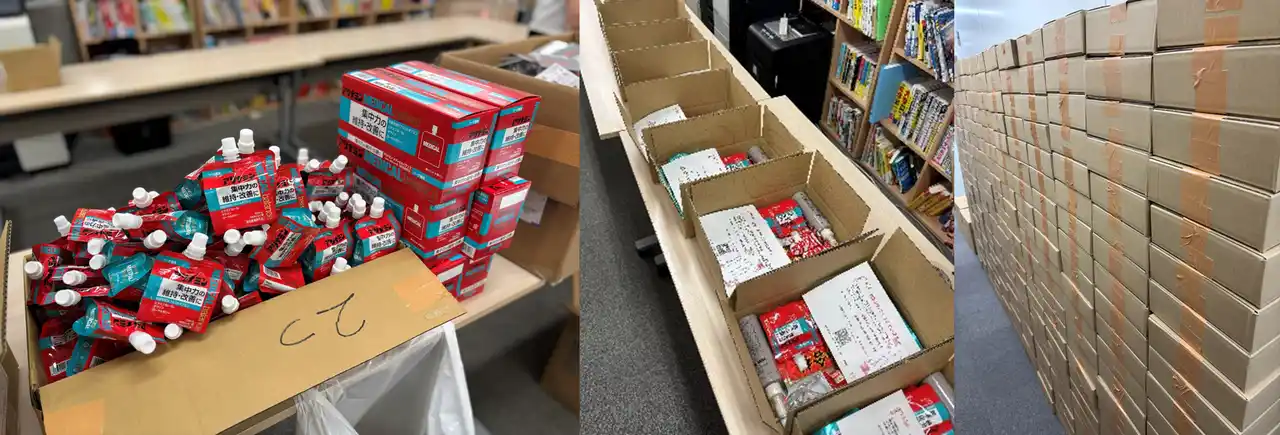 寄贈品のアリナミンメディカルバランス(指定医薬部外品)と完成したパッケージ、配送待ちのパッケージ |