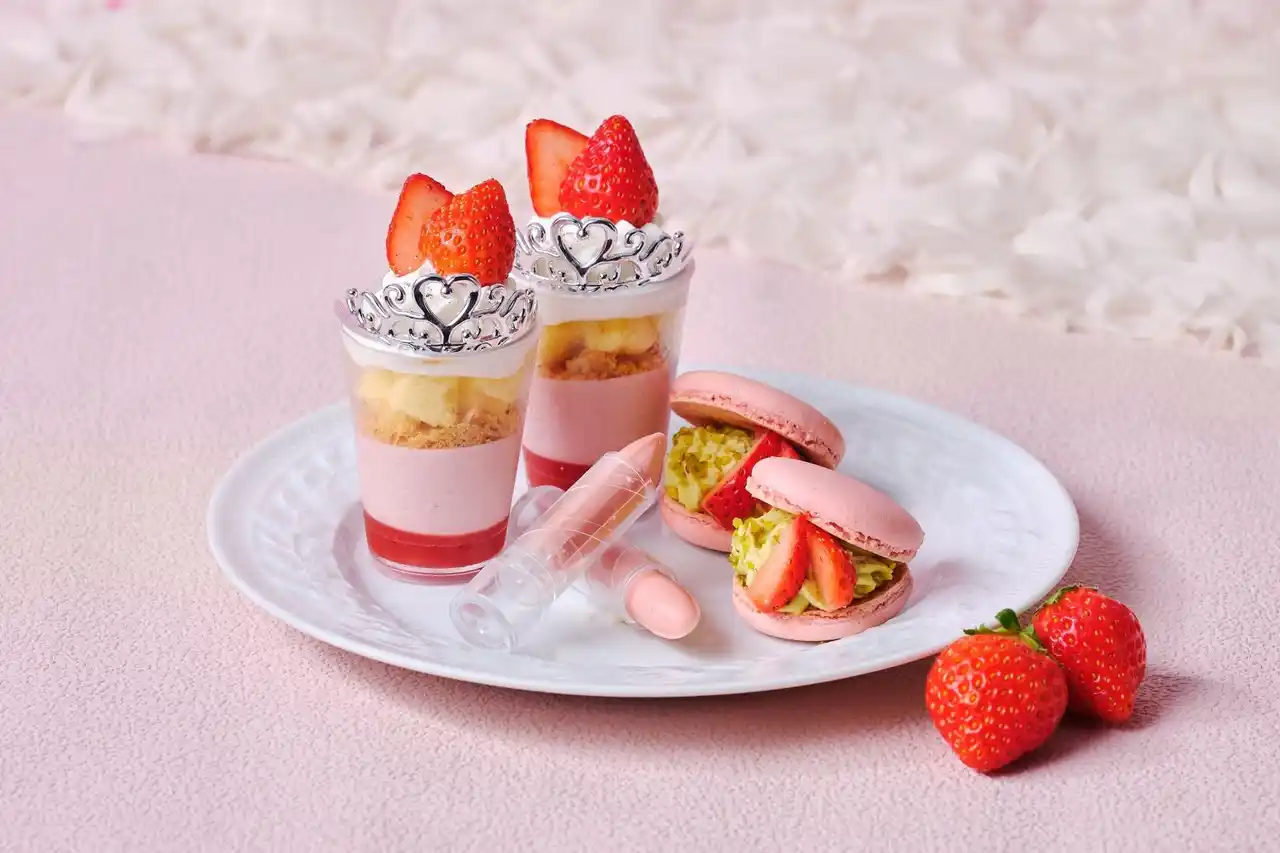 フレッシュないちごといちごのジュレとムースの層が美しいいちごのヴェリーヌをはじめ、ピスタチオの芳醇の香りが広がるいちごとピスタチオのマカロン、まるで本物のような、思わず手に取りたくなるリップスティックショコラ、なめらかクリーミーないちごのパンナコッタ、外はカリっと中はもっちりとしたピンクカヌレ、スタンド下段に鎮座するコスメのアイシャドウパレットを思わせるようないちごとカシスのアイパレットタルトなど、いちごづくしのプリンセスをモチーフにしたスイーツをご用意。 |